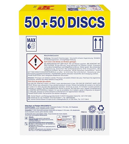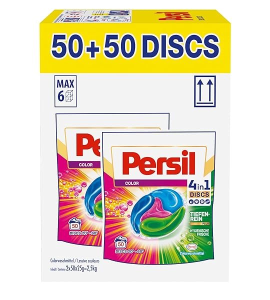 Durch die wasserlösliche Folie lassen sich die DISCS schnell und einfach anwenden. Persil Color 4in1 DISCS einfach hinten in die leere Waschtrommel platzieren, Wäsche darauf und fertig. Für eine Beladung von bis zu 4,5 kg ein DISC verwenden und bei einer Beladung von mehr als 4,5 kg oder bei stark verschmutzter Wäsche 2 DISCS. Außerhalb der Reichweite von Kindern aufbewahren.