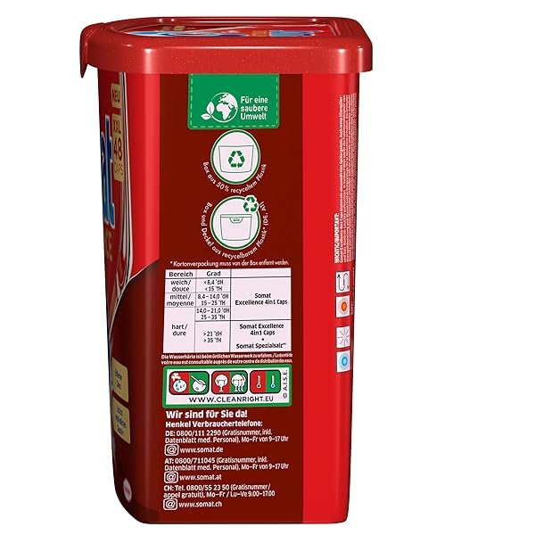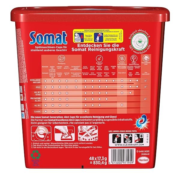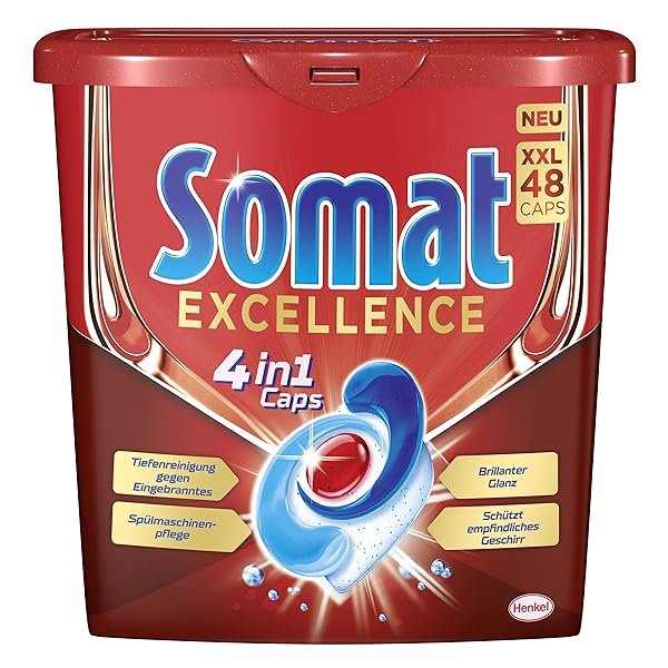 Die neue Revolution von Somat Die neue Generation Somat Excellence 4in1 Caps für exzellente Reinigung, brillanten Glanz und sorgfältige Pflege für Geschirr und Spülmaschine! Schnellauflösende Premium Spülmaschinen Caps mit einer einzigartigen Kombination aus Pulver und 3 festen Gelkammern in einer biologisch abbaubaren und 100 % wasserlöslichen Hülle. Die Formel der Somat Excellence 4in1 Caps vereint…